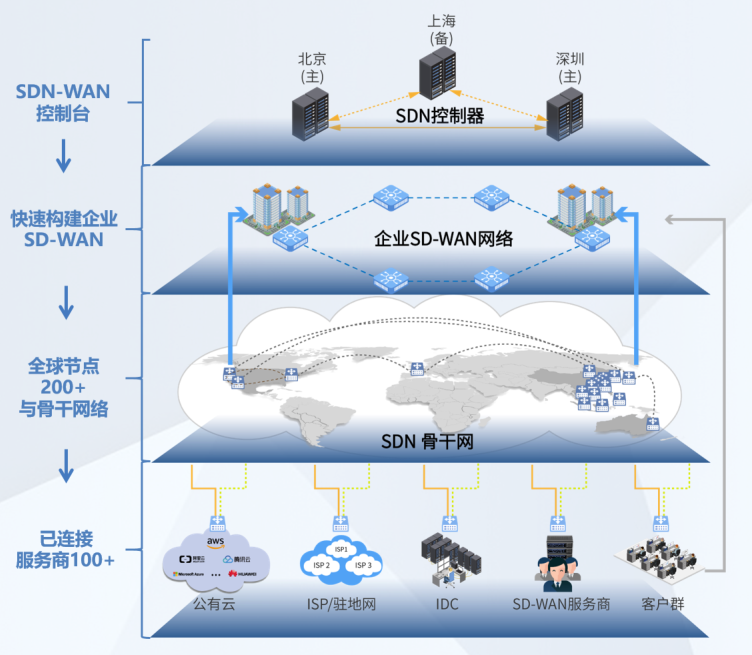 是指将SDN技术应用到广域网场景中所形成的一种产品或服务。这种产品或服务用于连接广阔地理范围的企业网络、数据中心、互联网应用及云服务,旨在帮助用户降低广域网的开支和提高网络连接灵活性。